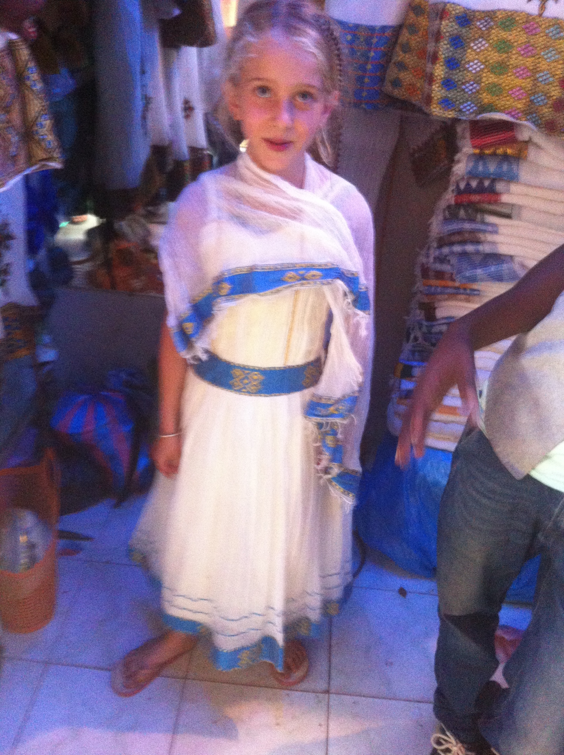On our last day in Ethiopia, before we flew off to Uganda, we put our haggling skills to the test in the daily market in Bahir Dar. Esme played her part to perfection when the shopkeeper refused to negotiate much off this traditional dress.